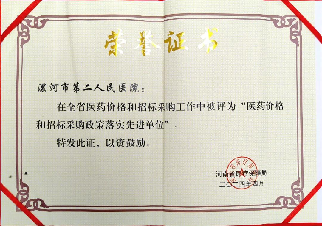 近日,市二院在全省醫(yī)藥價(jià)格和招標(biāo)采購工作綜合評(píng)價(jià)中,被河南省醫(yī)療保障局評(píng)為“醫(yī)藥價(jià)格和招標(biāo)采購政策落實(shí)先進(jìn)單位”。