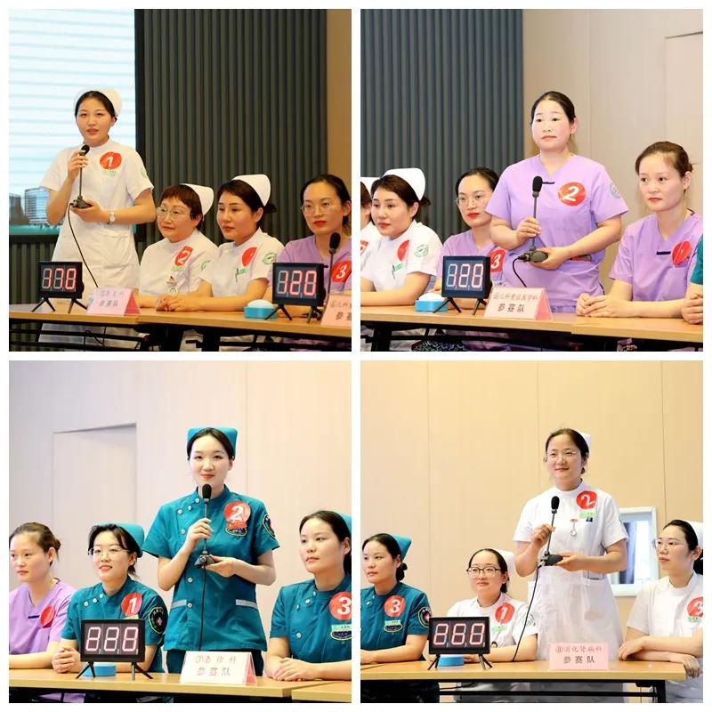 此次競賽內(nèi)容涵蓋基礎(chǔ)護理、專科護理、護理團體標(biāo)準(zhǔn)、核心制度、應(yīng)急預(yù)案等專業(yè)知識,分為初賽和決賽。此次活動,共有25個護理單元75名選手參加,經(jīng)過前期的層層選拔,8支代表隊24名選手參加了決賽。比賽現(xiàn)場氣氛火熱,高潮迭起,必答題環(huán)節(jié)各隊選手平分秋色,比分不相上下,隨著搶答環(huán)節(jié)的到來,比賽進入白熱化狀態(tài),各隊選手快速思考,競相搶答,上演了一場精彩紛呈的腦力與速度的較量;在風(fēng)險題環(huán)節(jié),各隊選手不甘落后,幾乎是在題目出現(xiàn)的瞬間就已經(jīng)有人按下了搶答器并給出準(zhǔn)確的答案,體現(xiàn)他們扎實的理論知識和深厚的實踐功底。