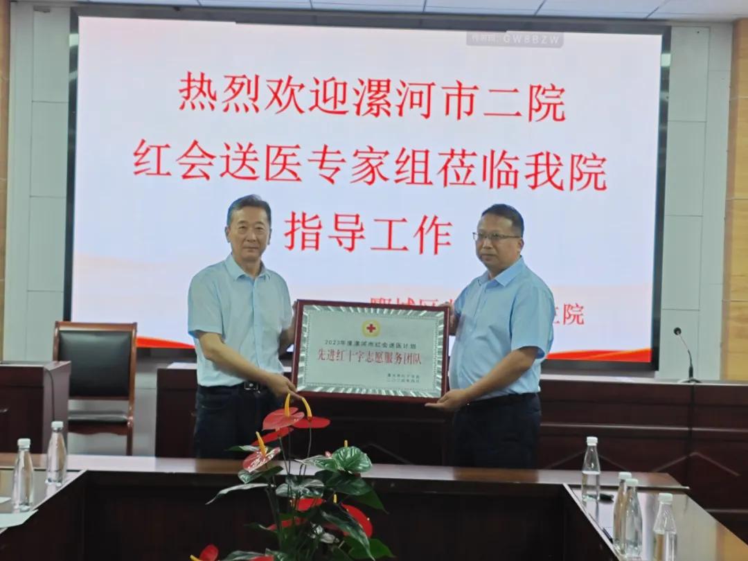 漯河市紅十字會黨組成員、副會長劉國防,市二院副院長張曉東,市二院工會主席李世學(xué),郾城區(qū)紅十字會副會長李山峰,龍城鎮(zhèn)衛(wèi)生院相關(guān)負(fù)責(zé)同志出席了本次對接會議和義診活動(dòng)。對接會上,市紅會副會長劉國防對市二院“紅會送醫(yī)計(jì)劃”所做的工作表示了高度的肯定,并向醫(yī)院頒發(fā)了2023年河南省“紅會送醫(yī)計(jì)劃”先進(jìn)單位、2023年漯河市“紅會送醫(yī)計(jì)劃”先進(jìn)單位兩塊獎(jiǎng)牌,對市二院李慧新等7名同志獲得省級和市級“優(yōu)秀紅十字醫(yī)療專家志愿者”稱號表示祝賀。