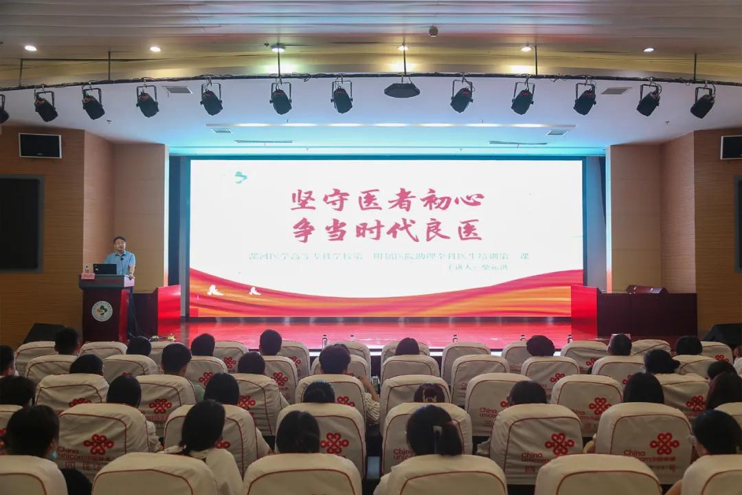 柴運(yùn)洪以“堅(jiān)守醫(yī)者初心、爭當(dāng)時(shí)代良醫(yī)”為題,對2023級、2024級全體助理全科醫(yī)生進(jìn)行思政教育。開篇引用了習(xí)近平總書記在中國醫(yī)師節(jié)慰問全國廣大醫(yī)務(wù)工作者時(shí)的重要指示“廣大醫(yī)務(wù)工作者是推動衛(wèi)生健康事業(yè)發(fā)展的重要力量。要堅(jiān)持人民至上、生命至上,崇尚醫(yī)德、鉆研醫(yī)術(shù)、秉持醫(yī)風(fēng)、勇?lián)厝危Υ龠M(jìn)醫(yī)學(xué)進(jìn)步,為建設(shè)健康中國、增進(jìn)人民健康福祉作出新貢獻(xiàn)。”