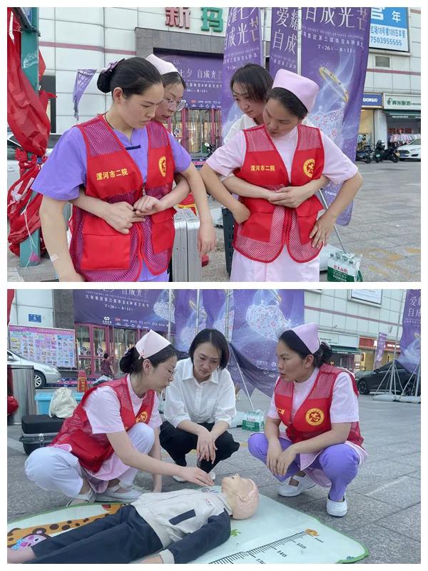 同時(shí),兒童重癥醫(yī)學(xué)科醫(yī)務(wù)人員講解了心肺復(fù)蘇、海姆立克等急救知識(shí),為現(xiàn)場(chǎng)群眾演示指導(dǎo)并帶領(lǐng)大家上手實(shí)際操作。