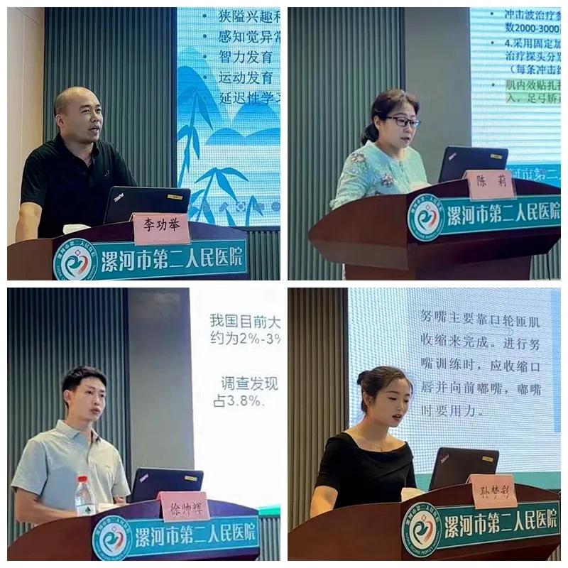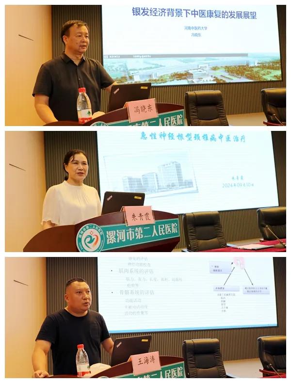學(xué)術(shù)交流環(huán)節(jié),河南省康復(fù)醫(yī)學(xué)會(huì)會(huì)長(zhǎng)、河南省中醫(yī)院院長(zhǎng)馮曉東、市二院中醫(yī)科主任朱青霞、市康復(fù)醫(yī)學(xué)會(huì)會(huì)長(zhǎng)王海濤、市醫(yī)專三附院兒童康復(fù)科副主任李功舉、市二院中醫(yī)科副主任治療師陳莉、臨潁縣人民醫(yī)院康復(fù)科主管治療師徐帥輝、市二院中醫(yī)科康復(fù)治療師孫夢(mèng)彩,分別就《銀發(fā)經(jīng)濟(jì)與康復(fù)醫(yī)學(xué)發(fā)展》《急性神經(jīng)根型頸椎病的綜合治療》《疼痛的康復(fù)評(píng)估和常用手法技術(shù)治療》《孤獨(dú)癥兒童情緒行為管理與教學(xué)策略》《脊柱側(cè)凸的診斷與治療》《沖擊波療法在疼痛疾病中的應(yīng)用》《面癱的康復(fù)鍛煉》為題進(jìn)行了全面細(xì)致地講解。