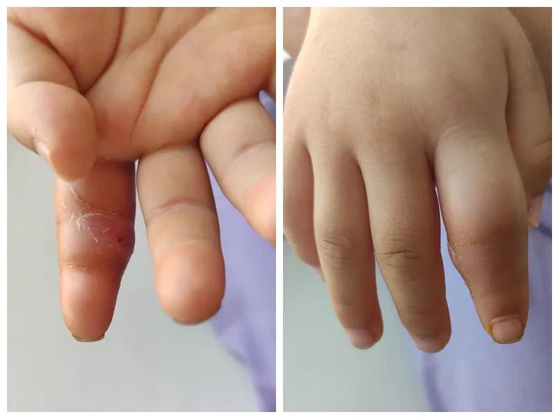 第三天開始,月月哭鬧不止,一直說手疼,怎么哄也不行,于是在當?shù)蒯t(yī)院治療了10來天,然而月月的手指依然腫得像個胡蘿卜,疼痛感依然存在。此時,月月的媽媽才覺得事情不大對勁,于是經(jīng)過打聽,慕名來到市二院顯微外科。入院后,經(jīng)檢查發(fā)現(xiàn),月月的右食指骨質(zhì)有侵蝕,骨骺有缺損,甚至會影響以后手指的發(fā)育。聽到這個消息,月月媽媽感覺心都揪住了。