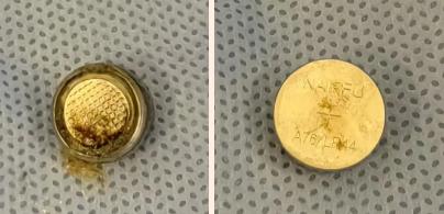 上圖為進(jìn)入鼻腔20分鐘的紐扣電池,已經(jīng)滲出強(qiáng)腐蝕性堿性液體,長時間會引起局部組織缺失和軟骨破壞,導(dǎo)致組織粘連或瘢痕形成,嚴(yán)重時引起鼻中隔穿孔等并發(fā)癥。