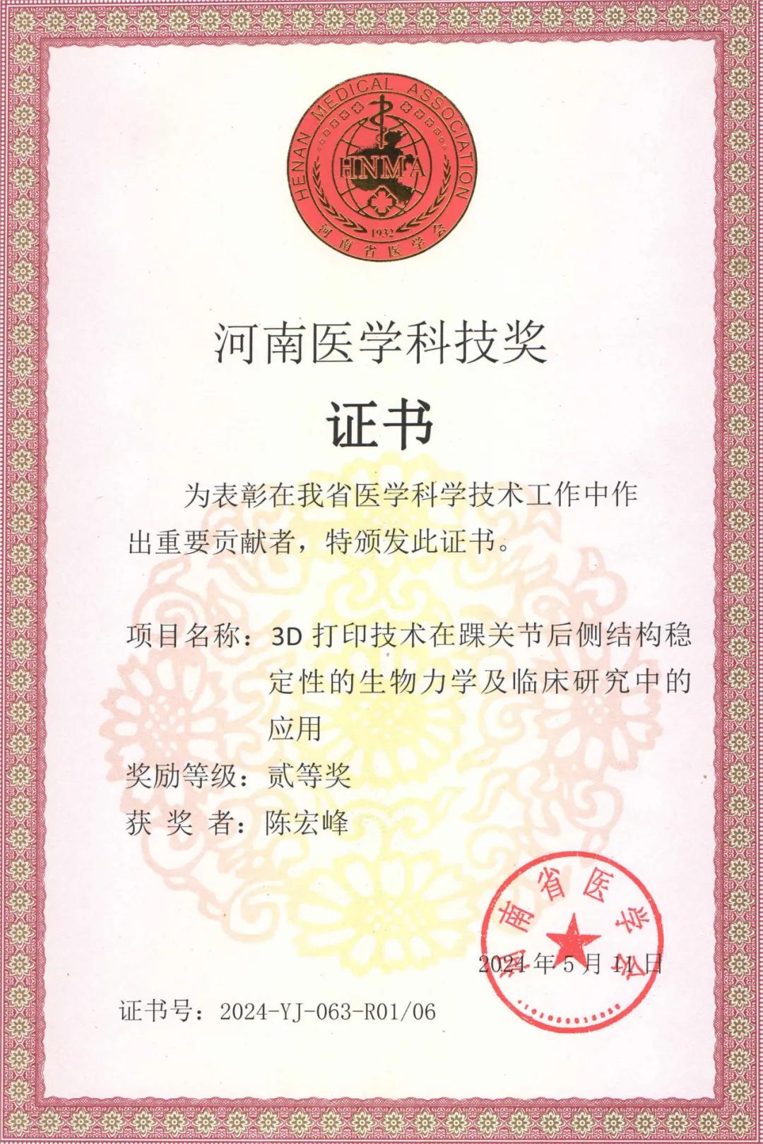 在陳宏峰主任帶領(lǐng)下,2012年起,在豫中南地區(qū)率先開展踇外翻、平足癥、高弓足畸形的規(guī)范化矯治。2012年完成豫中南第一例自體韌帶重建治療踝關(guān)節(jié)外側(cè)韌帶陳舊性損傷,2019年完成豫中南第一例踝上截骨術(shù)(SMO)治療踝關(guān)節(jié)骨性關(guān)節(jié)炎,2020年完成豫中南第一例軟骨移植術(shù)(AOT)治療距骨軟骨損傷。2021年完成豫中南第一例人工全踝關(guān)節(jié)置換術(shù)治療終末期踝關(guān)節(jié)骨性關(guān)節(jié)炎,2024年開展人工跖趾關(guān)節(jié)置換治療踇外翻、類風(fēng)濕關(guān)節(jié)炎足,相繼開展了脛骨橫向骨搬運術(shù)治療糖尿病足,應(yīng)用骨科手術(shù)機器人結(jié)合髓內(nèi)釘微創(chuàng)治療踝關(guān)節(jié)骨折、跟骨骨折,踝關(guān)節(jié)鏡下微創(chuàng)修復(fù)踝關(guān)節(jié)外側(cè)韌帶損傷等領(lǐng)先技術(shù),在豫中南地區(qū)享有盛譽。