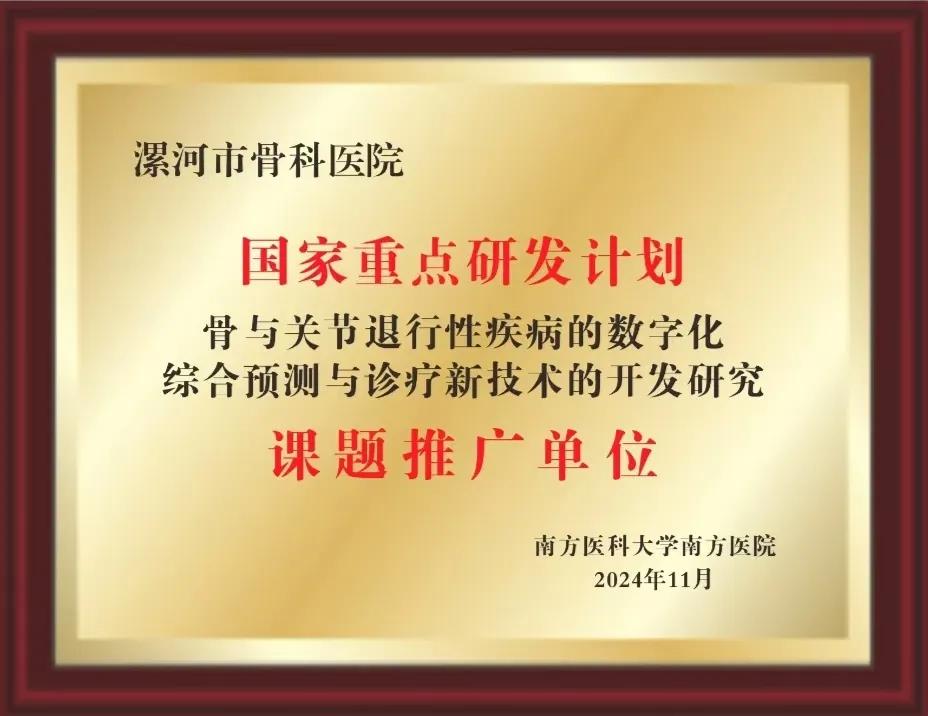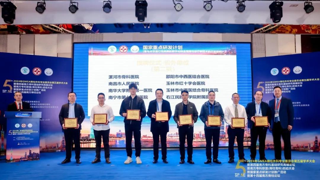 11月22日—24日,由廣東省醫(yī)學(xué)教育協(xié)會、南方醫(yī)科大學(xué)南方醫(yī)院脊柱骨科聯(lián)合主辦,廣東省醫(yī)學(xué)教育協(xié)會脊柱外科專業(yè)委員會承辦的“2024年GMEA脊柱外科專業(yè)委員會第五屆學(xué)術(shù)大會”在廣東廣州成功舉行。在南方專科聯(lián)盟(脊柱骨科)啟動大會暨國家重點研發(fā)計劃推廣活動上,漯河市骨科醫(yī)院(漯河醫(yī)專二附院、漯河市立醫(yī)院)榮獲“國家重點研發(fā)計劃-骨與關(guān)節(jié)退行性疾病的數(shù)字化綜合預(yù)測與診療新技術(shù)的開發(fā)研究課題推廣單位”與“南方??坡?lián)盟單位(脊柱外科)”雙項授牌!