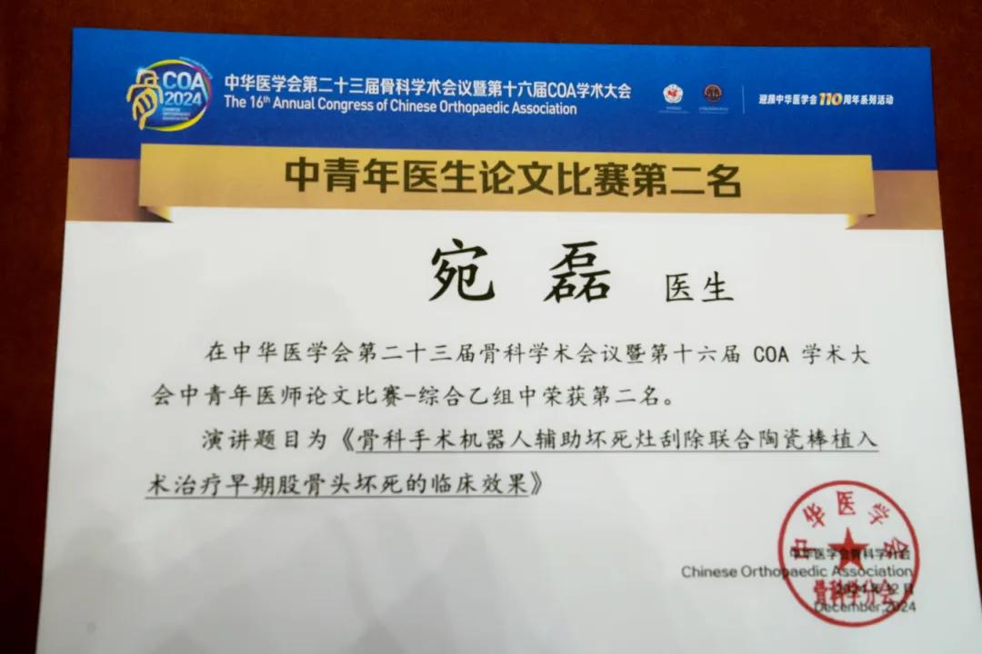 智能微創(chuàng)骨科(骨十)宛磊主任 在中青年醫(yī)生論文比賽-綜合乙組(二)會場進行參賽發(fā)言,最終以《骨科手術(shù)機器人輔助壞死灶刮除聯(lián)合陶瓷棒植入術(shù)治療早期股骨頭壞死的臨床效果 》為題獲得中青年論文比賽第二名。