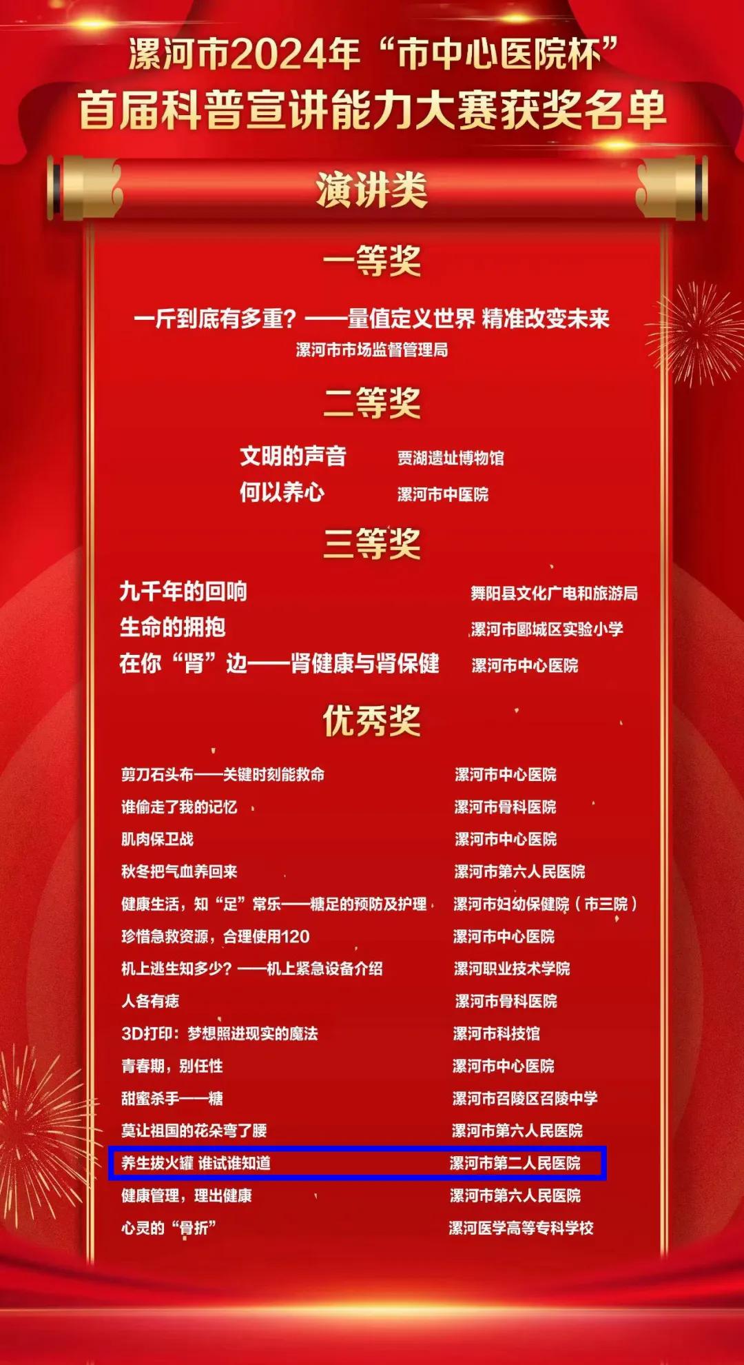 12月18日,由中共漯河市委宣傳部、中共漯河市委人才工作領導小組辦公室、漯河市科學技術協(xié)會、漯河市衛(wèi)生健康委員會聯(lián)合主辦,漯河市中心醫(yī)院冠名,漯河日報社承辦的漯河市2024年“市中心醫(yī)院杯”首屆科普宣講能力大賽決賽落下帷幕。經過激烈角逐,市二院精心選送的參賽作品由劉橋、李媛、安自譚、袁泉、任崢崢出演的《心臟“出走”記》榮獲舞臺表演類二等獎;由井紅鴿、李靜麗、鄭家珍、丁歡歡、程亞麗出演的《此“盆”非彼“盆”》榮獲舞臺表演類三等獎;另有四個參賽作品榮獲優(yōu)秀獎。