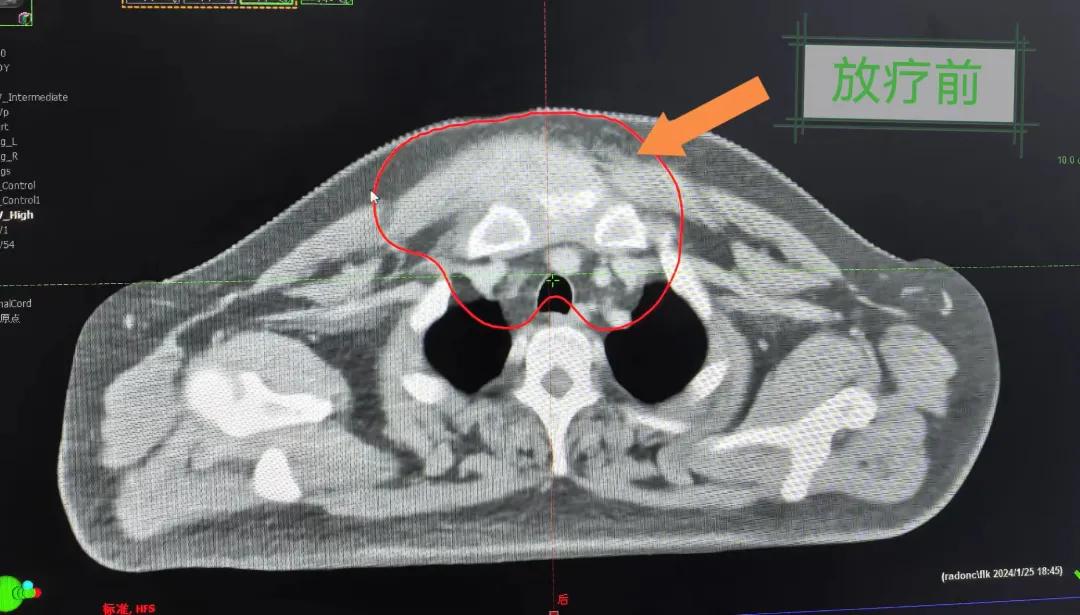 隨后,趙亮主任帶領(lǐng)放療團隊以最快的速度完成了患者的放射治療計劃,在保證放療精準打擊腫瘤的同時,利用先進的三維立體精確放療技術(shù),最大限度的避免心臟、肺部的損傷發(fā)生,整體治療精準度達到1mm以內(nèi)。經(jīng)過10次的放射治療后,患者疼痛已明顯減輕,胸部腫物肉眼可見的縮小,患者及家屬臉上終于露出久違的笑臉。