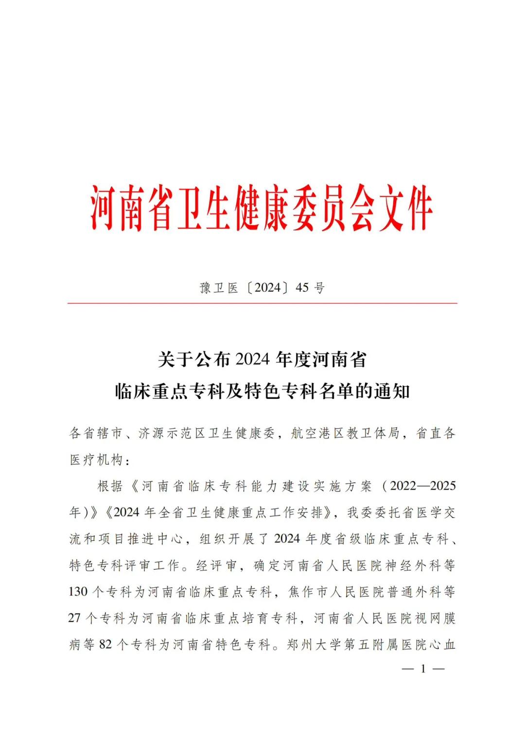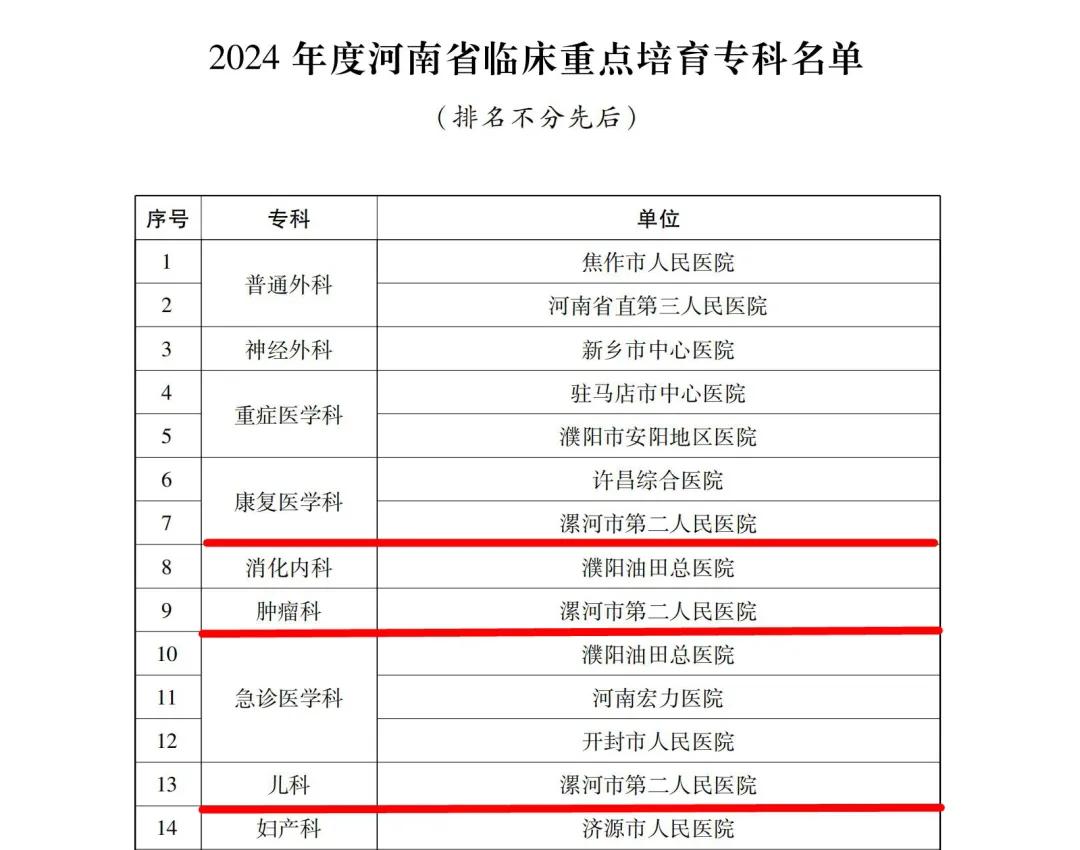 12月24日,河南省衛(wèi)生健康委下發(fā)了《關(guān)于公布2024年度河南省臨床重點(diǎn)??萍疤厣珜?泼麊蔚耐ㄖ罚ㄔバl(wèi)醫(yī)〔2024〕45號(hào))。市二院兒科、腫瘤科(腫瘤放療科、腫瘤內(nèi)科)、康復(fù)醫(yī)學(xué)科成功通過評(píng)審,被確定為河南省臨床重點(diǎn)培育???。