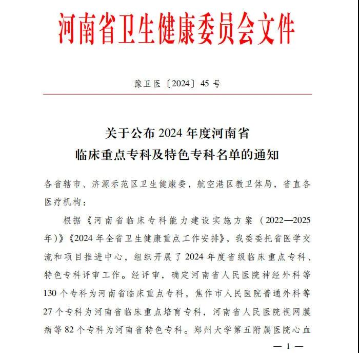 12月24日,河南省衛(wèi)生健康委下發(fā)《關(guān)于公布2024年度河南省臨床重點(diǎn)??萍疤厣珜?泼麊蔚耐ㄖ罚ㄔバl(wèi)醫(yī)〔2024〕45號)。漯河醫(yī)專高等??茖W(xué)校第二附屬醫(yī)院運(yùn)動醫(yī)學(xué)科、護(hù)理??瞥晒νㄟ^評審,被確定為河南省臨床重點(diǎn)培育專科。