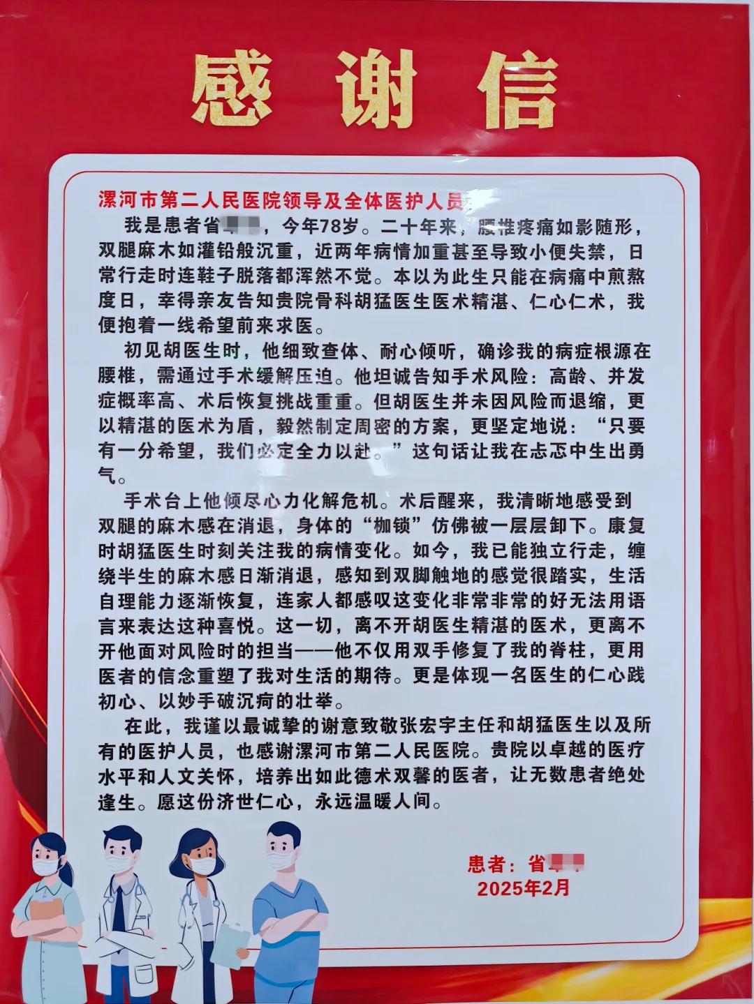 近日,家住西華的患者省奶奶,因椎管狹窄于市二院骨科成功完成單側(cè)雙通道脊柱內(nèi)鏡下腰椎管減壓術(shù),取得良好效果,家屬特地送來錦旗和感謝信,表達他們的感激之情。
