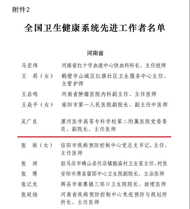 近日,人力資源社會保障部、國家衛(wèi)生健康委、國家中醫(yī)藥局、國家疾控局決定,授予326個單位“全國衛(wèi)生健康系統(tǒng)先進(jìn)集體”稱號,授予749名同志“全國衛(wèi)生健康系統(tǒng)先進(jìn)工作者”稱號,授予30名同志“‘白求恩獎?wù)?rsquo;獲得者”稱號。我院副院長吳廣良教授被授予“全國衛(wèi)生健康系統(tǒng)先進(jìn)工作者”稱號。