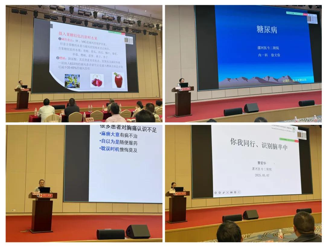 授課現(xiàn)場,風(fēng)濕免疫病專家劉國鋒教授、心血管內(nèi)科一病區(qū)主任陳建忠、神經(jīng)內(nèi)科二病區(qū)主任曹愛華、內(nèi)分泌科主任徐文儉分別圍繞《痛風(fēng)的干預(yù)策略》《胸痛識別急救與冠心病的預(yù)防》《你我同行、識別腦卒中》《糖尿病的防治》進(jìn)行精彩分享。
