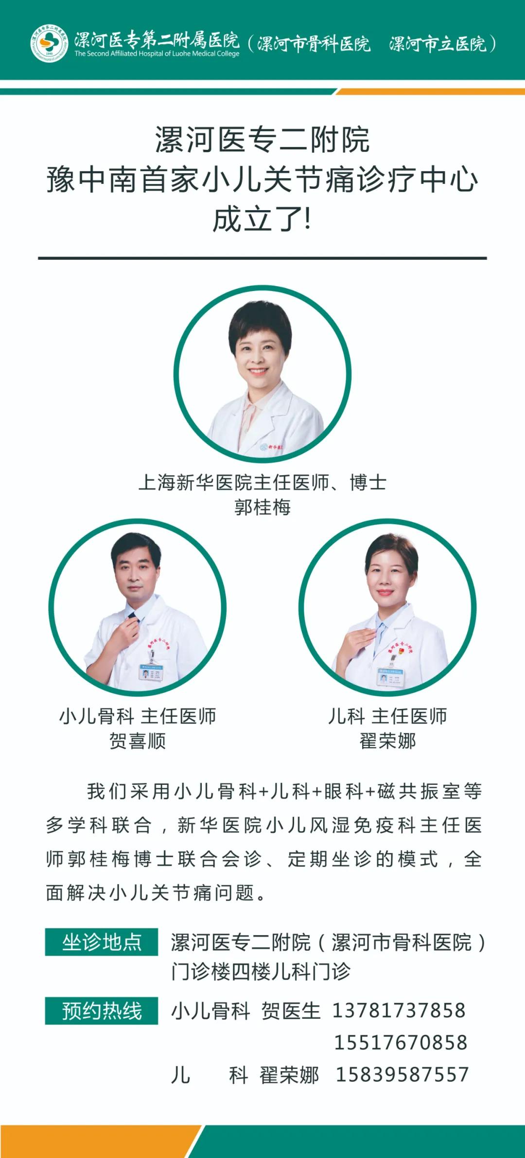 小兒關(guān)節(jié)痛診斷和治療的關(guān)鍵是通過(guò)專業(yè)診斷來(lái)區(qū)分不同的病因,為此,漯河醫(yī)專二附院(漯河市骨科醫(yī)院,漯河市立醫(yī)院)成立了豫中南地區(qū)首家“小兒關(guān)節(jié)痛多學(xué)科診療中心”!