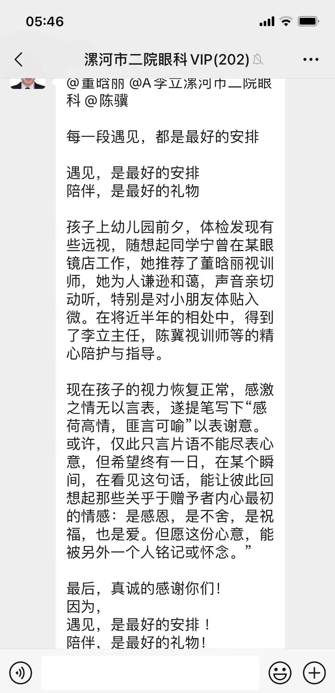 孩子上幼兒園前夕,體檢發(fā)現(xiàn)有些遠(yuǎn)視,想起同學(xué)寧曾在某眼鏡店工作,她推薦了董晗麗視訓(xùn)師,她為人謙遜和藹,聲音親切動聽,特別是對小朋友體貼入微。在將近半年的相處中,得到了李立主任,陳冀視訓(xùn)師等的精心陪護與指導(dǎo)。