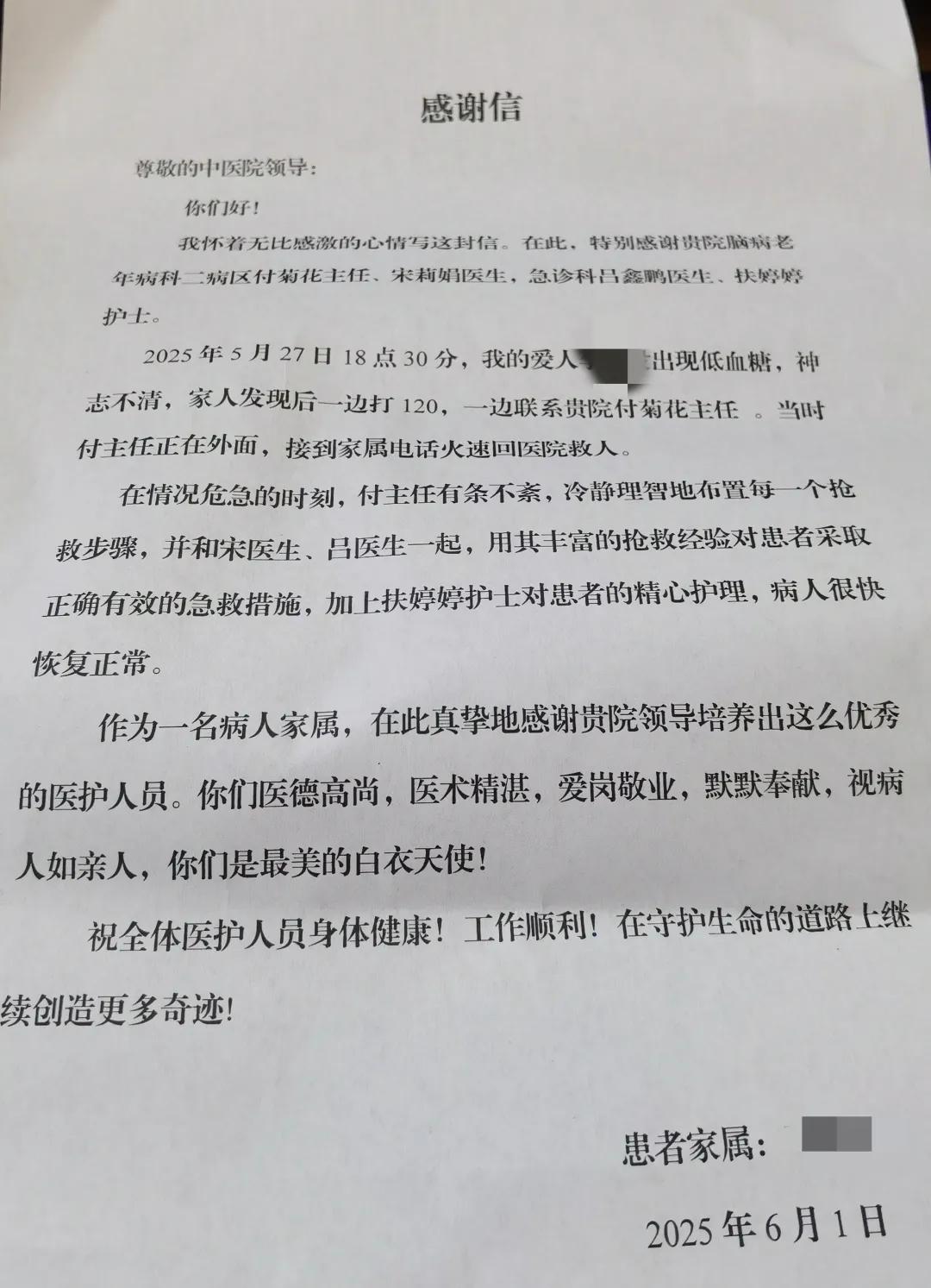 據(jù)了解,該女士其丈夫患腦血管疾病,曾在市中醫(yī)院腦二科就診,是腦二病區(qū)付菊花主任的病人,后多次到腦二科找付醫(yī)生復(fù)診。5月27日晚,患者病情危急,患者家屬趕忙聯(lián)系付菊花,付菊花當(dāng)時(shí)已下班回家,她接到電話后立即與院急診科和腦二科宋莉娟醫(yī)生聯(lián)系開展相關(guān)救治工作并抓緊到醫(yī)院參與救治,還用“醫(yī)生全年無休守護(hù)患者”的暖心話語安慰焦急的患者家屬。急診科的呂鑫鵬、扶婷婷也對患者采取正確有效的急救措施及精心護(hù)理,經(jīng)過各科室的精心救治,患者癥狀快速好轉(zhuǎn),病人家屬特送來信表示感謝。