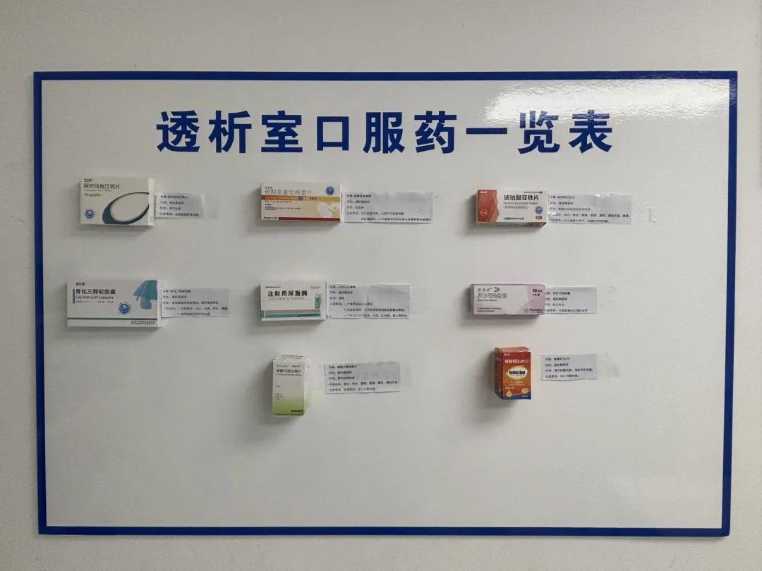隨著醫(yī)學(xué)技術(shù)的發(fā)展,高齡患者越來(lái)越多,即便醫(yī)護(hù)人員反復(fù)講解用藥方法,患者和家屬仍可能因記憶模糊、理解偏差導(dǎo)致用錯(cuò)藥。為了解決這一難題,血液凈化室推行 “口服藥上墻” 舉措,患者可以拿著自己藥盒與墻上的藥盒進(jìn)行一一對(duì)照。藥盒旁配有詳盡說(shuō)明,圖文并茂,直觀易懂,有效避免用藥誤區(qū),確?;颊哂盟幇踩?,提升治療效果。