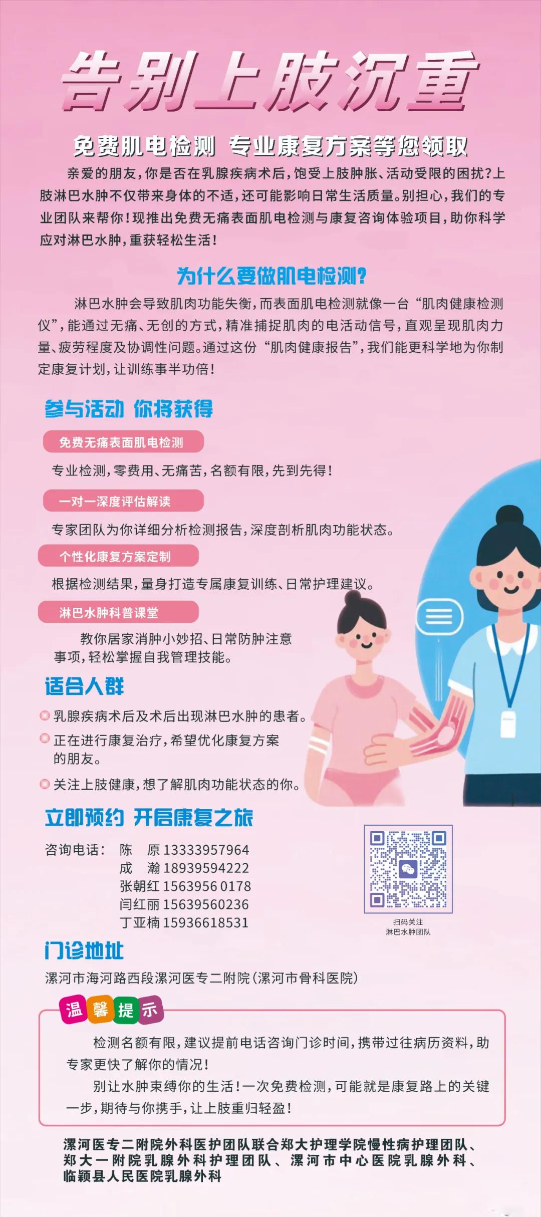 漯河醫(yī)專二附院聯(lián)合省市級多專家團(tuán)隊推出公益項目,于6月20日開放免費無痛檢測名額,含一對一報告解讀與康復(fù)指導(dǎo),助您科學(xué)應(yīng)對水腫困擾。立即致電咨詢預(yù)約,讓專業(yè)團(tuán)隊為您的上肢健康保駕護(hù)航!