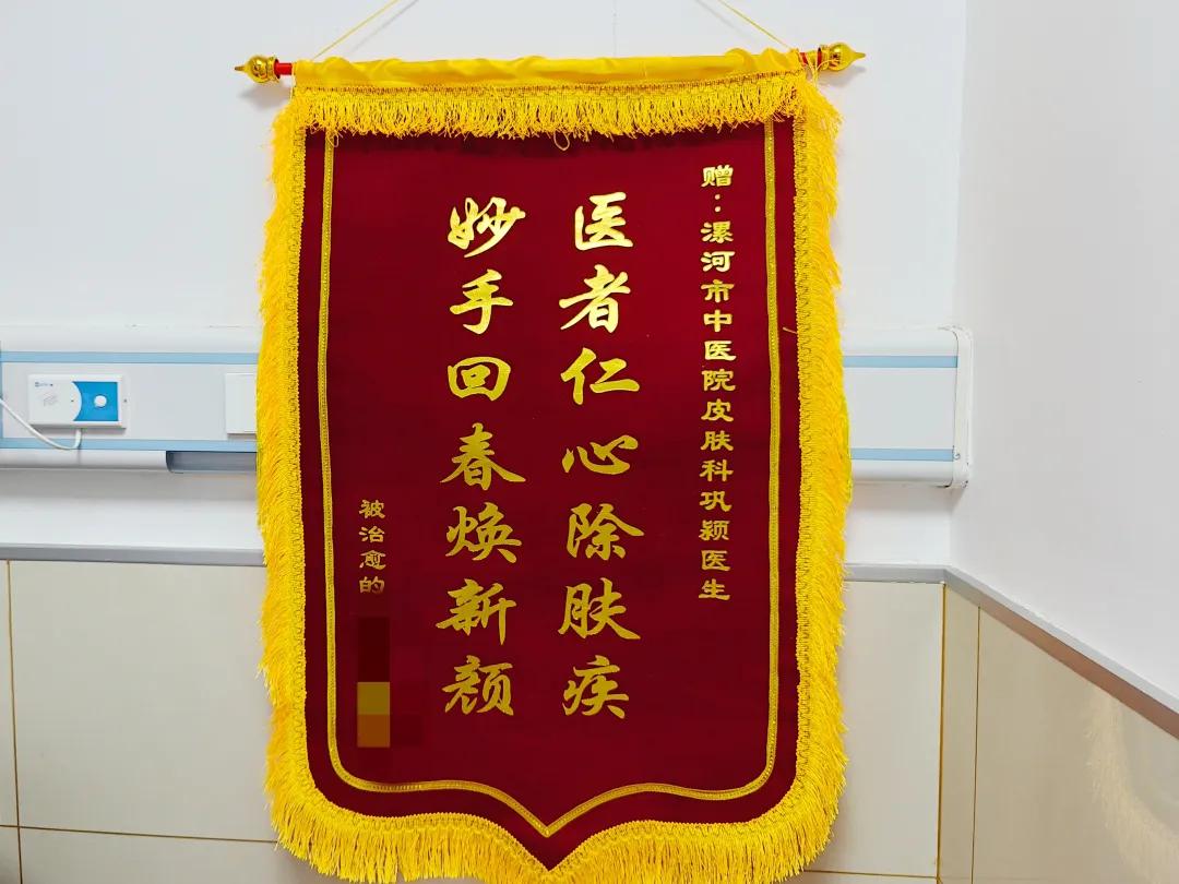 近日,漯河市中醫(yī)院皮膚科鞏潁醫(yī)生收到病人感謝的錦旗,上面寫著“醫(yī)者仁心除膚疾,妙手回春煥新顏”,短短文字表達對醫(yī)生醫(yī)術(shù)的認可與自己頭發(fā)重新生長的喜悅。
