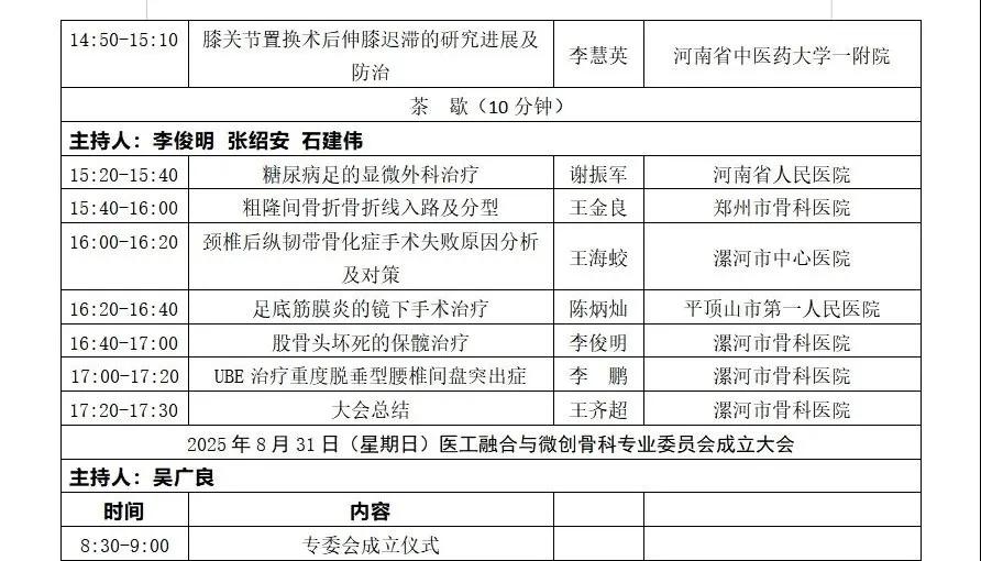 漯河市骨科醫(yī)院: 8月30日-31日,首屆沙澧骨科高峰論壇暨河南省物理醫(yī)學(xué)學(xué)會(huì)醫(yī)工融合與微創(chuàng)骨科專業(yè)委員會(huì)成立大會(huì)誠(chéng)邀您的蒞臨!