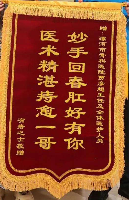 近日,漯河醫(yī)專二附院(漯河市骨科醫(yī)院、漯河市立醫(yī)院)肛腸科收到一面滿載心意的錦旗?;颊呶罩Z彥超主任的手再三致謝,錦旗上“妙手回春肛好有你,醫(yī)術(shù)精湛痔愈一哥”十六個大字,既是對醫(yī)護人員專業(yè)能力的肯定,更是對肛腸科中西醫(yī)結(jié)合診療水平的認(rèn)可。