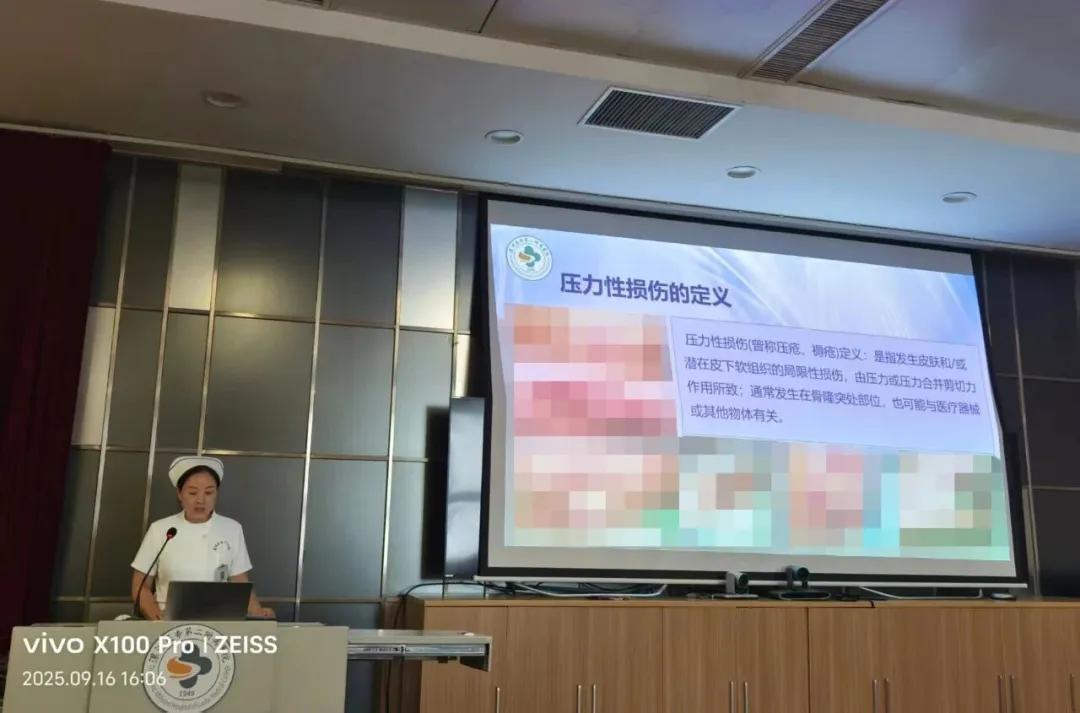 培訓(xùn)伊始,壓力性損傷/傷口護(hù)理學(xué)組會(huì)診干預(yù)組長(zhǎng)張燕燕老師帶來(lái)關(guān)于《新型敷料在壓力性損傷中的應(yīng)用》的主題分享。她結(jié)合大量臨床案例,細(xì)致講解了各類新型敷料的材質(zhì)特性、適用場(chǎng)景,以及壓力性損傷不同分期對(duì)應(yīng)的敷料選擇策略、操作規(guī)范和效果評(píng)估方法。從水膠體敷料到泡沫敷料,從藻酸鹽敷料到銀離子敷料,張老師一一剖析,讓參訓(xùn)人員對(duì)新型敷料的臨床應(yīng)用有了更精準(zhǔn)、全面的認(rèn)識(shí),為科學(xué)選擇和使用敷料提供了堅(jiān)實(shí)理論支撐。