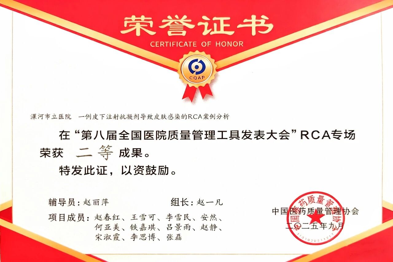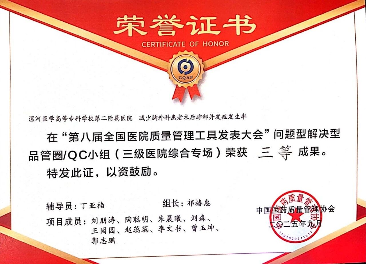 近日,第八屆醫(yī)院質(zhì)量管理工具應(yīng)用成果發(fā)表大會在重慶落幕。此次大賽共有來自全國的600多項課題參賽,其中413個項目入圍決賽,競爭激烈。 漯河醫(yī)專二附院(漯河市骨科醫(yī)院、漯河市立醫(yī)院)關(guān)節(jié)外科選送的RCA項目與胸外科選送的"非常好圈"品管圈項目,在各自專場中展現(xiàn)了扎實的專業(yè)素養(yǎng),最終在眾多優(yōu)秀團(tuán)隊中勝出,分別斬獲二等獎和三等獎。