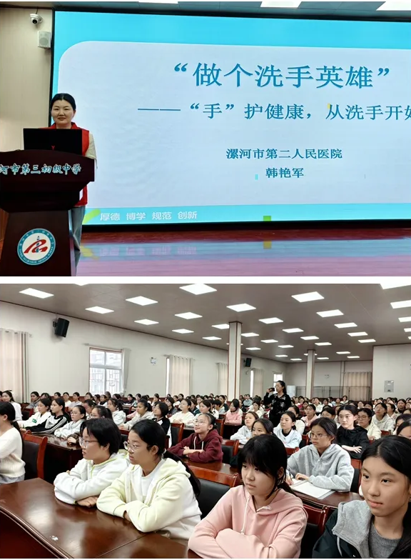 此外,市二院感控辦工作人員專程走進(jìn)市第三初級(jí)中學(xué),為學(xué)生們帶來了一場(chǎng)別開生面的手衛(wèi)生知識(shí)講座。工作人員以“手”護(hù)健康為切入點(diǎn),通過專題講座、播放宣傳視頻、講解洗手重要性、演示“七步洗手法”等環(huán)節(jié),深入淺出地向同學(xué)們闡述了洗手這一最簡(jiǎn)單、經(jīng)濟(jì)且有效的健康守護(hù)方法,有效提升了青少年群體的手衛(wèi)生知識(shí)與自我防護(hù)能力。