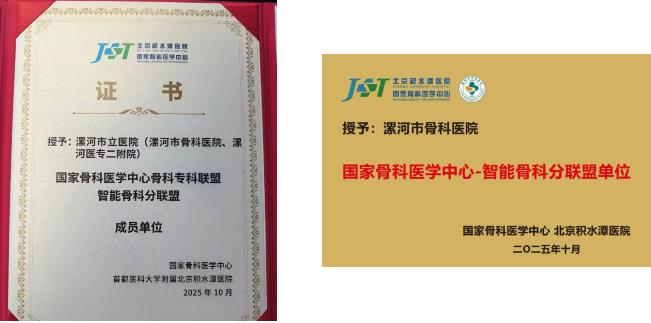 10月18日,國家骨科醫(yī)學中心骨科??坡?lián)盟智能骨科分聯(lián)盟授牌儀式在北京積水潭醫(yī)院舉辦,漯河醫(yī)專二附院(漯河市骨科醫(yī)院、漯河市立醫(yī)院)憑借在骨科領域的卓越實力和創(chuàng)新探索,成為智能骨科分聯(lián)盟成員單位。