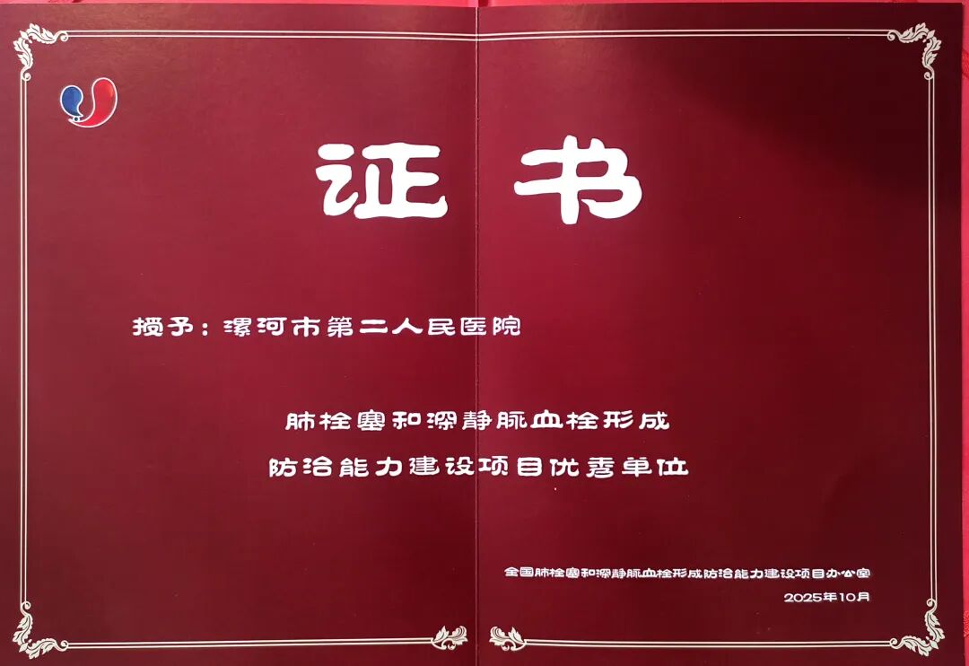 漯河市二院獲評“全國肺栓塞和深靜脈血栓形成防治能力建設(shè)項目優(yōu)秀單位”