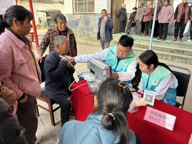 活動現(xiàn)場,漯河醫(yī)專二附院各科醫(yī)療專家志愿者熟練操作便攜式診療設備,有序的為當?shù)卮迕衩赓M測量血壓、手指血糖、甲狀腺彩超、骨密度檢測、眼底篩查、體格檢查、用藥指導、健康咨詢、疾病診斷等。面對前來就診的群眾,專家們耐心傾聽村民的病情描述,細致詢問既往病史、用藥情況,結(jié)合專業(yè)檢查給出精準診斷,同時圍繞常見慢性病管理、冬季傳染病預防、合理用藥等知識,發(fā)放宣傳手冊,用通俗易懂的語言為村民答疑解惑。