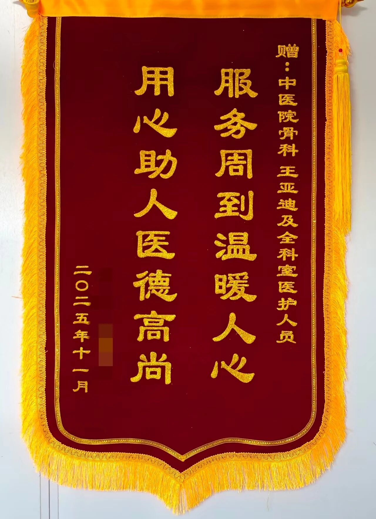 “你們不僅醫(yī)術(shù)高超,還特別有耐心,讓我感受到了家人般的溫暖。” 送錦旗時,黃女士反復(fù)說著感謝。面對贊譽,主管醫(yī)生王亞迪笑著回應(yīng):“這是我們醫(yī)務(wù)人員應(yīng)該做的,看到患者康復(fù),就是我們最大的心愿。” 一面錦旗,不僅是患者對醫(yī)護團隊的認(rèn)可,更是醫(yī)患之間濃濃真情的見證。(骨 科 王亞迪)
