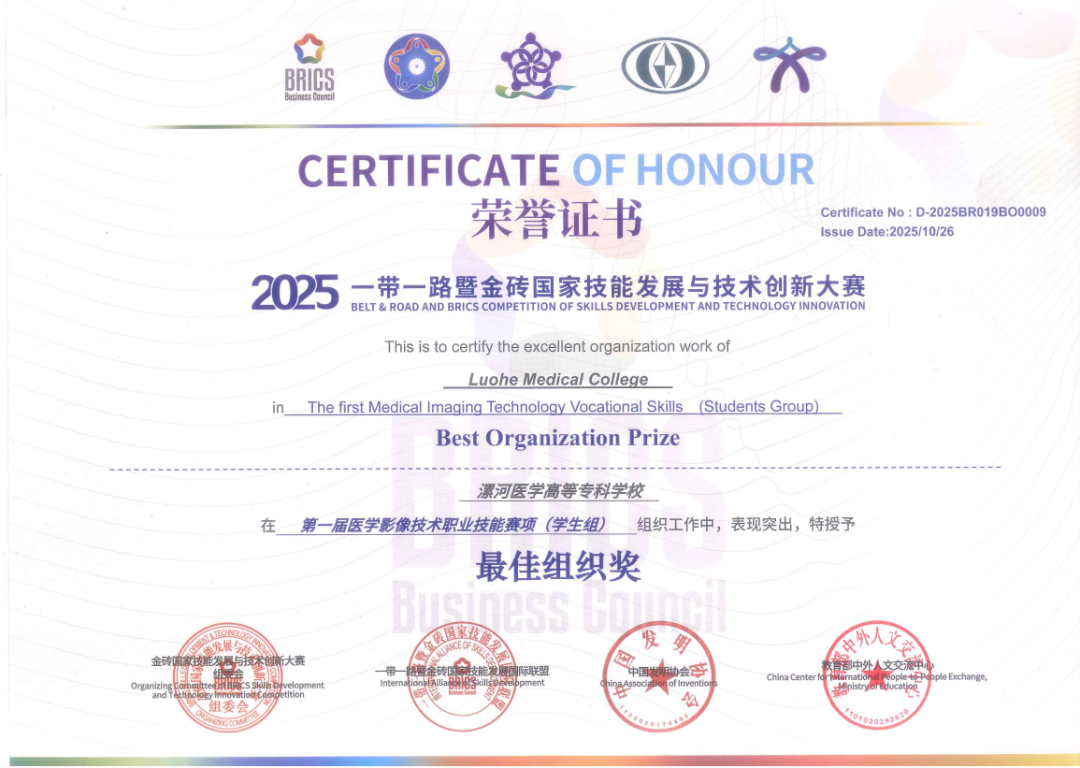 教師團隊亦表現不俗,孫英杰老師在“醫(yī)學影像教學創(chuàng)新賽項”中獲三等獎,王海波、劉曉梅、丁琦峰三位老師因在賽前指導中表現突出,被授予“優(yōu)秀指導教師”稱號。尤為值得一提的是,周山主任及其帶教團隊因組織有序、動員充分、師生整體表現優(yōu)異,被大賽組委會授予“最佳組織獎”——這也是繼2025年9月第十二屆“泰山杯”全國醫(yī)學影像技術專業(yè)大學生實踐技能大賽以來,漯河醫(yī)專二附院醫(yī)學影像教學團隊又一次參加此項全國性的醫(yī)學影像技術專業(yè)實踐技能大賽的優(yōu)異成績。