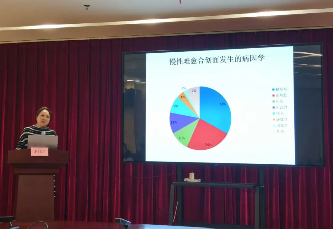 漯河市第三人民醫(yī)院新生兒科護士長馬麗明、漯河醫(yī)專二附院胸外科護士長丁亞楠共同主持,由河南省傷口造口專業(yè)委員會副主任委員、國際造口治療師王月芹教授主講的首場授課。王教授以《慢性創(chuàng)面治療策略》為題,深入淺出地講解了慢性創(chuàng)面治療策略核心是圍繞“病因控制-創(chuàng)面床準(zhǔn)備-修復(fù)重建”三大核心環(huán)節(jié),通過多學(xué)科協(xié)作,動態(tài)調(diào)整方案以打破創(chuàng)面遷延不愈的惡性循環(huán)。王教授帶來最前沿的學(xué)術(shù)成果、用最鮮活的臨床案例和最實用的操作技巧。讓我們收獲解決實際問題的“金鑰匙”。