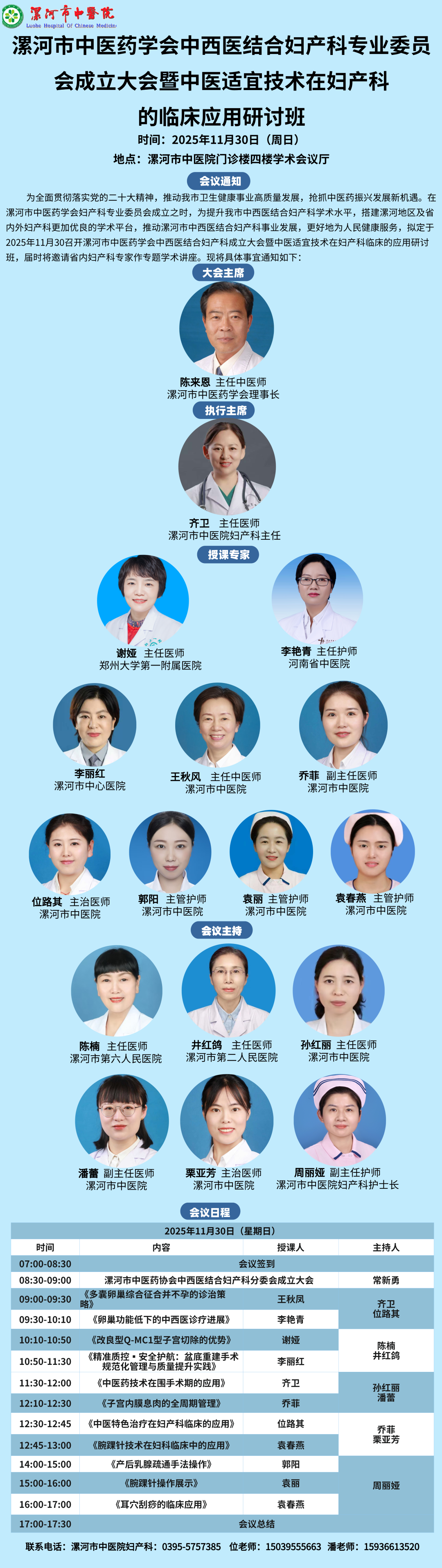 【學(xué)術(shù)通知】11月30日,漯河市中醫(yī)藥學(xué)會中西醫(yī)結(jié)合婦產(chǎn)科專業(yè)委員會成立大會暨中醫(yī)適宜技術(shù)在婦產(chǎn)科的臨床應(yīng)用研討班