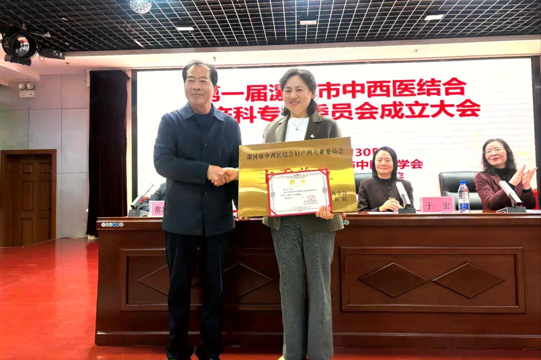 漯河市中醫(yī)藥學(xué)會(huì)理事長(zhǎng)陳來(lái)恩為漯河市中醫(yī)藥學(xué)會(huì)中西醫(yī)結(jié)合婦產(chǎn)科專(zhuān)業(yè)委員會(huì)的成立揭牌并給本次大會(huì)主任委員齊衛(wèi)頒發(fā)聘書(shū)。