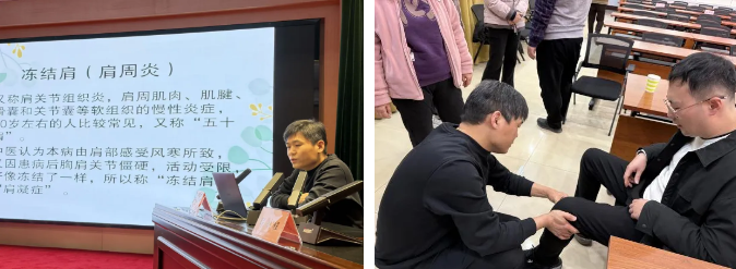 曹愛華主任強(qiáng)調(diào)了卒中防治的重要性,并針對職場人群常見的健康隱患,詳細(xì)講解了腦卒中的早期識別方法。同時,分享了高血壓、糖尿病、血脂異常等危險因素的科學(xué)管控方法,促使大家養(yǎng)成良好的飲食和生活習(xí)慣。宋松根副主任結(jié)合職工工作特點(diǎn),重點(diǎn)講解了冠心病的防治、急性心肌梗死的典型癥狀及急救三步法,并分享了“控血壓、調(diào)血脂、控血糖、適度運(yùn)動、堅(jiān)持服藥”的ABCDE健康管理法則。金艷南副主任醫(yī)師則講解了肩周炎常見認(rèn)識誤區(qū)、多種病因、“疼痛期、僵硬期、緩解期”三階段臨床表現(xiàn)和功能鍛煉的階梯方法,并現(xiàn)場示范了鐘擺運(yùn)動、爬墻運(yùn)動等簡單易行的預(yù)防鍛煉動作,從日常細(xì)節(jié)中守護(hù)關(guān)節(jié)健康。
