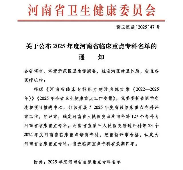 近日,河南省衛(wèi)生健康委發(fā)布《關(guān)于公布2025年度河南省臨床重點(diǎn)名單的通知》(豫衛(wèi)醫(yī)函〔2025〕47號(hào)),漯河醫(yī)專二附院(漯河市骨科醫(yī)院、漯河市立醫(yī)院)運(yùn)動(dòng)醫(yī)學(xué)科與護(hù)理??瞥晒νㄟ^評(píng)審被確定為河南省臨床重點(diǎn)專科。漯河醫(yī)專二附院再添兩個(gè)省級(jí)臨床重點(diǎn)???,標(biāo)志著這兩大??圃卺t(yī)療技術(shù)、科研創(chuàng)新、服務(wù)質(zhì)量及區(qū)域影響力等方面達(dá)到省內(nèi)領(lǐng)先水平。