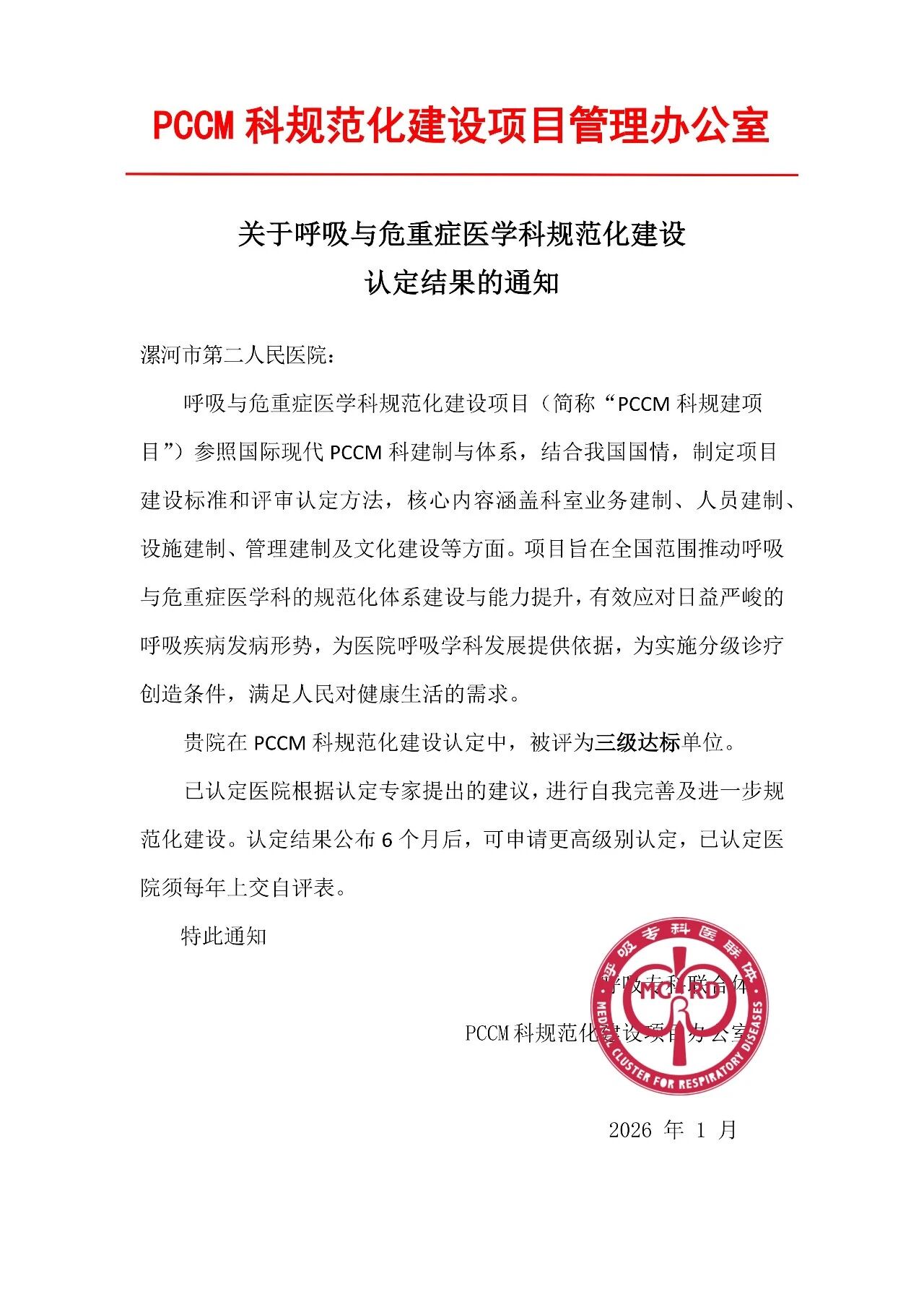 2026年1月10-11日,2026年中國呼吸學(xué)科發(fā)展大會(huì)在北京召開。會(huì)上,公布了2025年度呼吸與危重癥醫(yī)學(xué)科(PCCM)評(píng)審結(jié)果,漯河市第二人民醫(yī)院呼吸與危重癥醫(yī)學(xué)科達(dá)到三級(jí)醫(yī)院呼吸學(xué)科達(dá)標(biāo)標(biāo)準(zhǔn)。