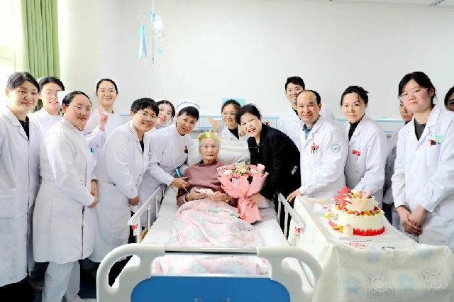 得知今天是潘奶奶97歲生日,醫(yī)院黨委高度重視,專門委派副院長劉橋帶領(lǐng)科室醫(yī)護(hù)人員手捧著鮮花和蛋糕,為潘奶奶送上真摯的生日祝福,病房內(nèi)洋溢著歡聲笑語,溫暖而感人。伴隨著《生日快樂》歌曲的旋律,潘奶奶在家人和醫(yī)護(hù)人員的簇?fù)硐?,臉上綻放出驚喜的笑容,連聲道謝:“沒想到住院還能過生日,你們真是太有心了!”