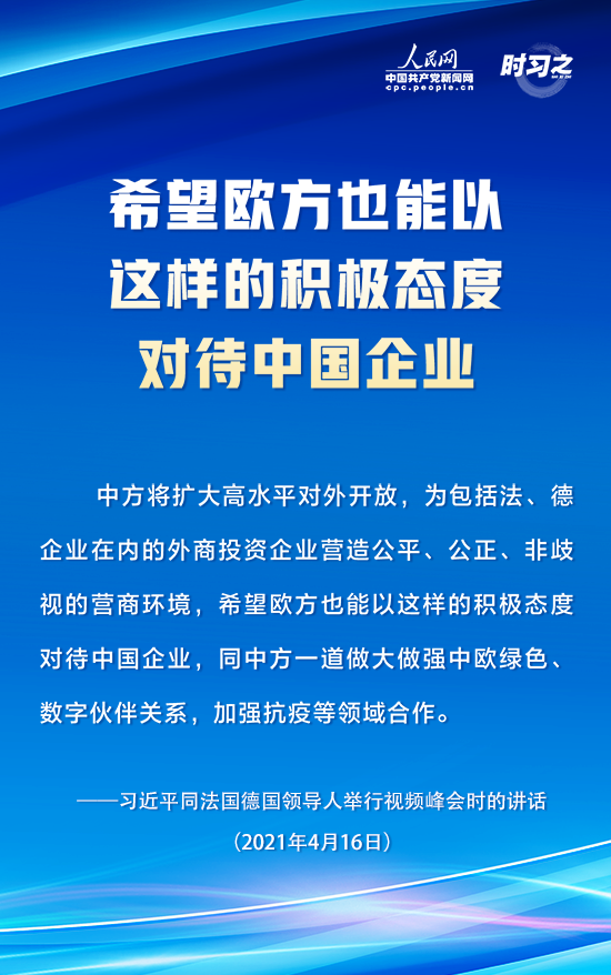 4月16日下午,國(guó)家主席習(xí)近平在北京同法國(guó)總統(tǒng)馬克龍、德國(guó)總理默克爾舉行中法德領(lǐng)導(dǎo)人視頻峰會(huì)。三國(guó)領(lǐng)導(dǎo)人就合作應(yīng)對(duì)氣候變化、中歐關(guān)系、抗疫合作以及重大國(guó)際和地區(qū)問(wèn)題深入交換意見(jiàn)。人民網(wǎng)·中國(guó)共產(chǎn)黨新聞網(wǎng)“時(shí)習(xí)之”欄目摘錄了習(xí)近平在這次視頻峰會(huì)上的重要講話內(nèi)容,一起學(xué)習(xí)。