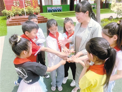 王艷霞和孩子們做游戲。