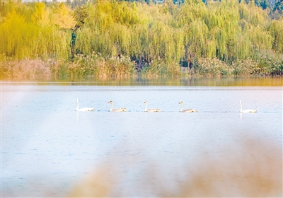 天鵝的到來,讓附近的居民興奮不已,不少人在遠處觀看,還拿著手機拍攝天鵝戲水的情景。陳璐介紹,2021年春天,有30多只天鵝在這里停留,今年3月有3批共27只天鵝光臨。