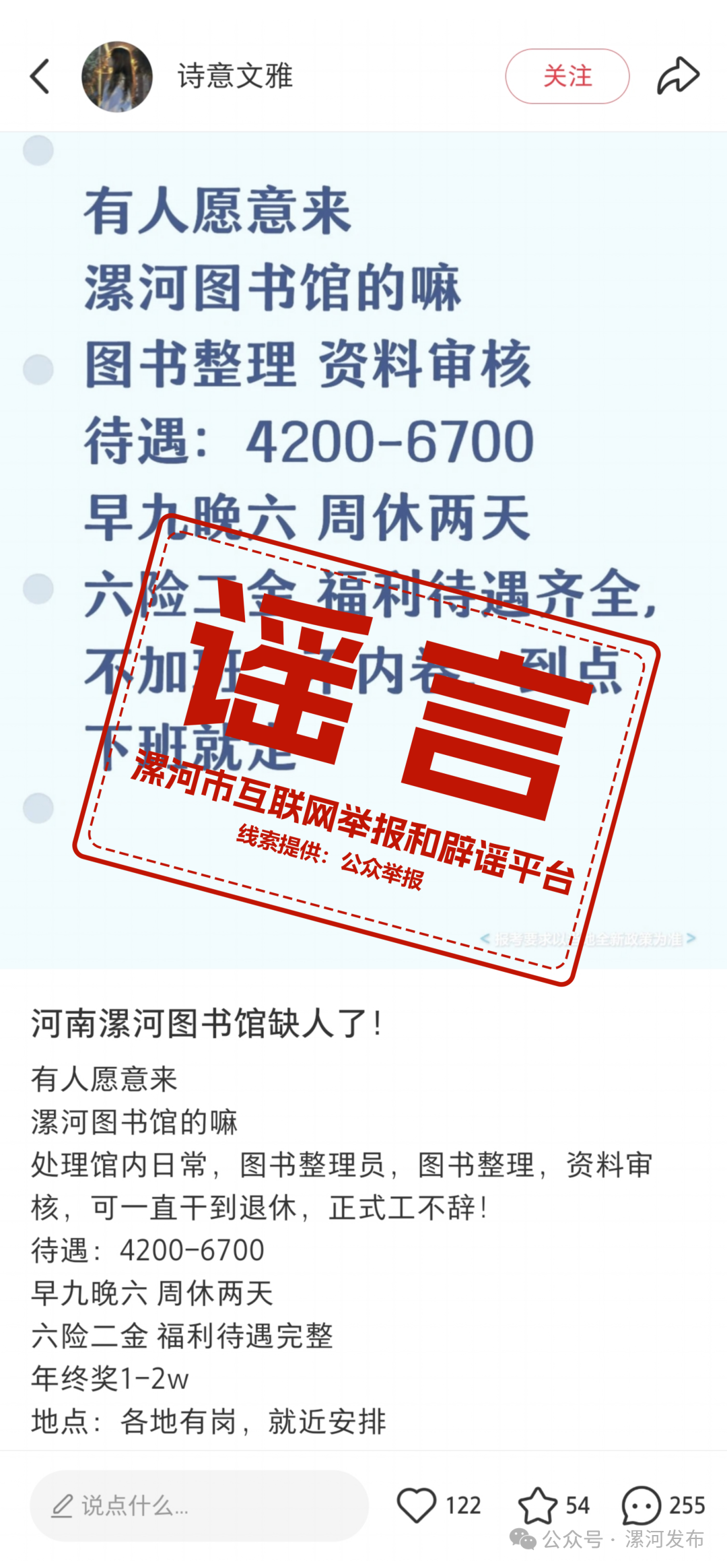 經(jīng)向相關(guān)部門(mén)核實(shí),漯河市圖書(shū)館并未發(fā)布此類招聘信息,該內(nèi)容系不法分子編造的虛假信息。據(jù)了解,漯河市圖書(shū)館所有招募、培訓(xùn)、合作洽談等官方信息,均通過(guò)漯河市人力資源和社會(huì)保障局網(wǎng)站、漯河市文化廣電和旅游局網(wǎng)站統(tǒng)一發(fā)布,漯河市圖書(shū)館從未授權(quán)任何自媒體平臺(tái)、商業(yè)網(wǎng)站、個(gè)人及第三方機(jī)構(gòu)以漯河市圖書(shū)館名義開(kāi)展招聘及各類招錄相關(guān)活動(dòng)。