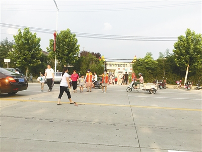 當(dāng)天下午,記者來到位于太行山路北段東側(cè)的孟廟鎮(zhèn)中心幼兒園門口。正值幼兒園放學(xué)時間,接送孩子的家長較多,部分家長把車輛停在了學(xué)校對面,接到孩子后需要穿過馬路回家。因為路上沒有設(shè)置安全警示牌,也沒有減速帶、斑馬線等交通標(biāo)識,家長帶著孩子在車流中穿梭(如圖)。