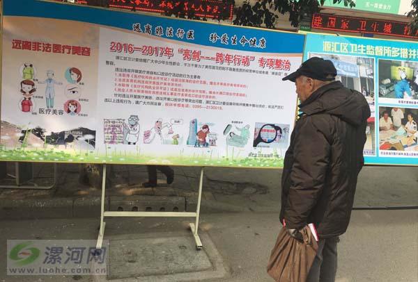 1月24日上午,源匯區(qū)衛(wèi)計(jì)委監(jiān)督所組織人員在五一路與人民路交叉口南100米處開(kāi)展了“2016-2017年亮劍--跨年行動(dòng)”宣傳工作,此次宣傳的主題是“嚴(yán)厲打擊非法醫(yī)療美容、非法口腔診療活動(dòng)的行為”,違法違規(guī)開(kāi)展醫(yī)療美容和口腔診療活動(dòng)的行為主要有: