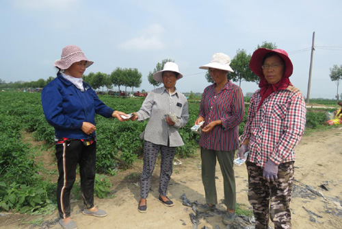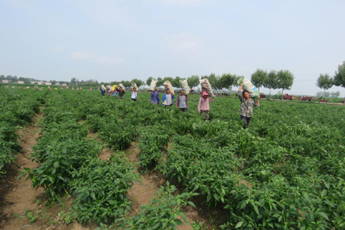圖為臨潁縣王孟鎮(zhèn)石拐村自安產(chǎn)業(yè)扶貧基地的社員們,在辣椒基地采摘辣椒時(shí)的情景。