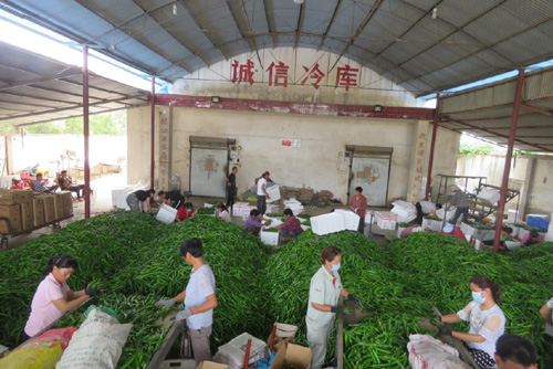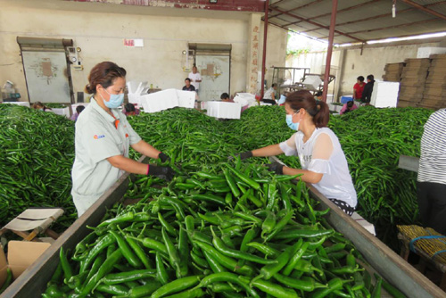 圖為臨潁縣王孟鎮(zhèn)石拐村自安產(chǎn)業(yè)扶貧基地的社員們,在冷庫(kù)為辣椒分揀、裝箱、冷藏時(shí)的情景。