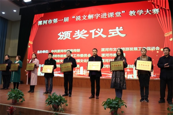 11月29日,由中共漯河市委宣傳部、漯河市文化旅游發(fā)展工作促進(jìn)會,漯河市語言文字工作委員會,漯河市教育局、河南省文字學(xué)會許慎文化研究會、漯河市日報社聯(lián)合舉辦的漯河市第一屆“說文解字進(jìn)課堂”教學(xué)大賽總決賽及頒獎典禮在漯河市郾城中學(xué)舉行。郾城中學(xué)東校區(qū)教師常賽男獲得“說文解字進(jìn)課堂”教學(xué)大賽初中組一等獎,郾城區(qū)實驗小學(xué)曹艷紅獲得“說文解字進(jìn)課堂”教學(xué)大賽小學(xué)組一等獎,郾城區(qū)教育局、郾城中學(xué)均獲得“說文解字進(jìn)課堂”教學(xué)大賽優(yōu)秀組織獎
